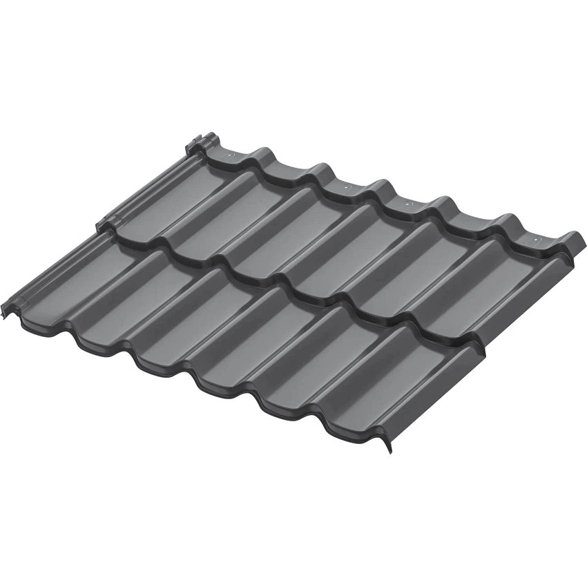 Металлическая модульная черепица Стокгольм XXL. Ключевым преимуществом металлической модульной черепицы AQUASYSTEM является скрытое крепление листов к обрешетке, что позволяет добиться непревзойдённой надёжности кровли и повышенной эстетики. Отличительной особенностью модульной черепицы являются стандартные размеры листов длиной в 2 модуля по 400 мм, что даёт колоссальные преимущества при хранении и транспортировке поддонов с черепицей. Имеет максимальную защиту от коррозии (первый класс цинкования) и повышенную УФ-стабильность. Гарантия 50 лет.