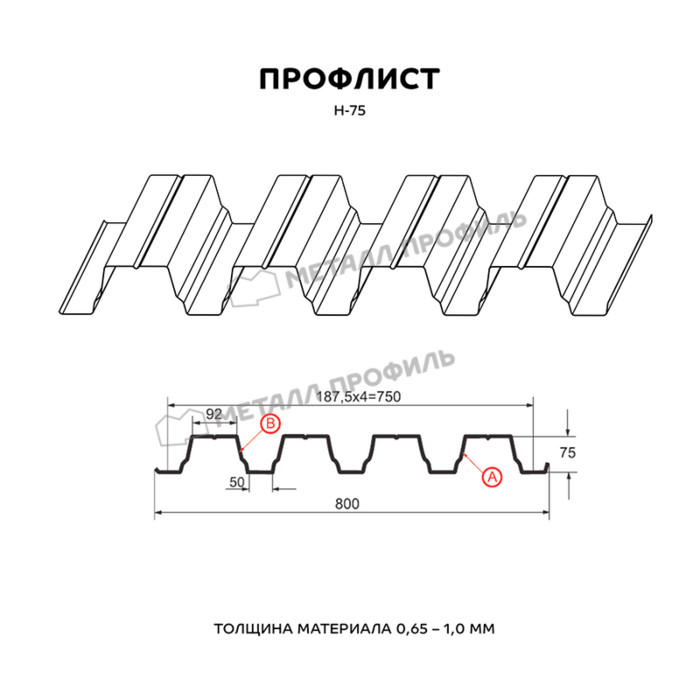Профлист изготовлен из металла толщиной 0.65 мм, что обеспечивает ему высокую прочность и долговечность. Он имеет форму Н-75, которая обеспечивает надежное крепление и защиту от внешних воздействий.